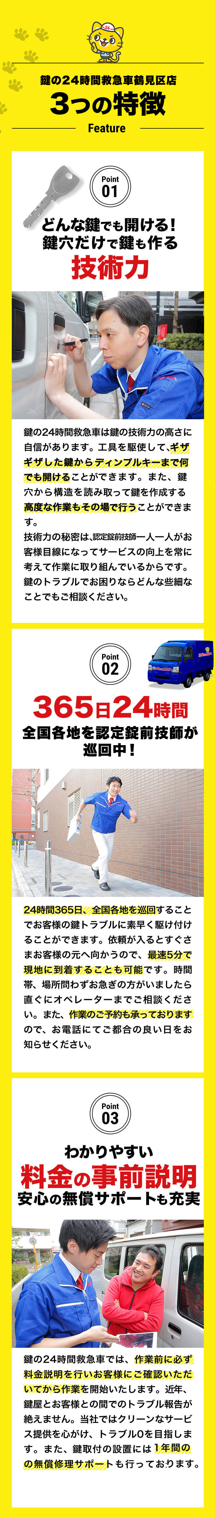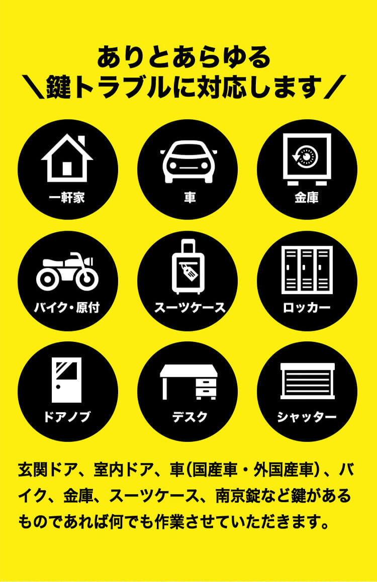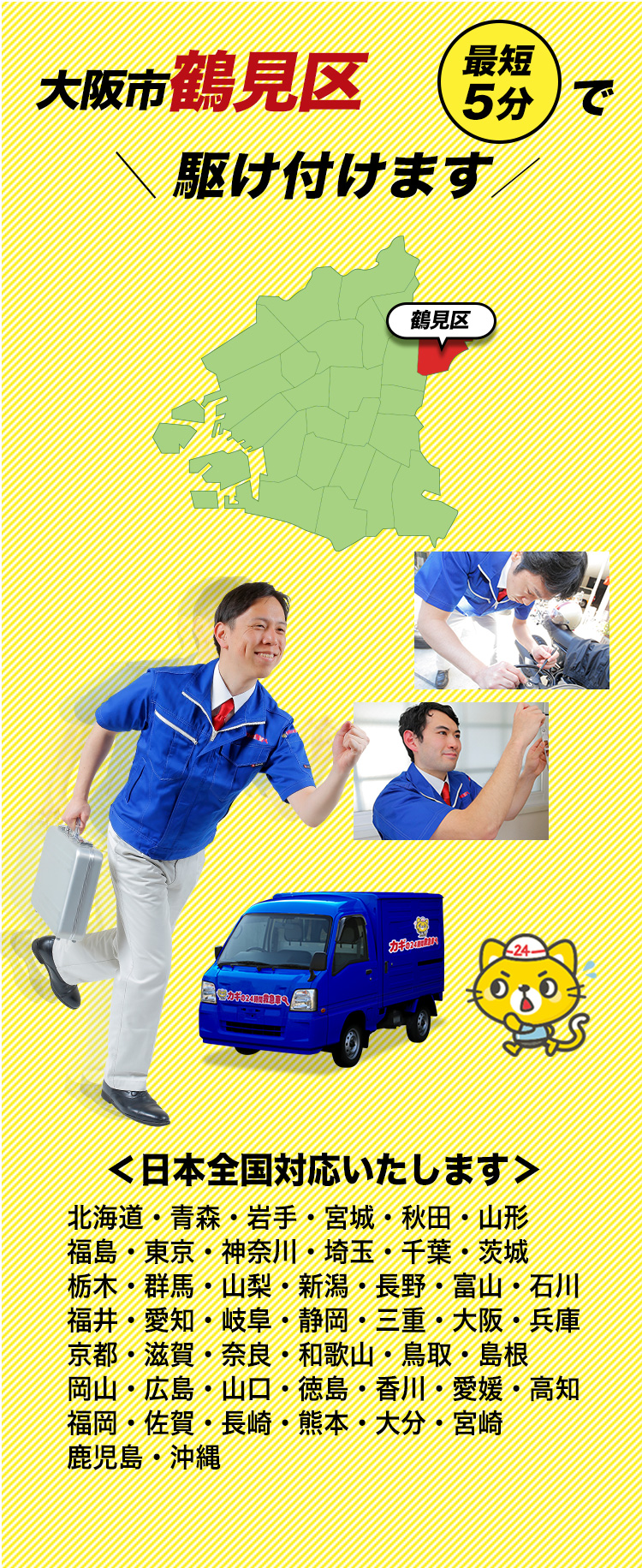 鶴見区店では、スタッフが地元の鶴見緑地でのジョギングを通じて体力と精神力を鍛えています。この持続的なエネルギーをもって、鍵開け、鍵交換、鍵修理のサービスを24時間提供。鶴見区で確かな技術と迅速な対応をお求めの方は、当店をお選びください。